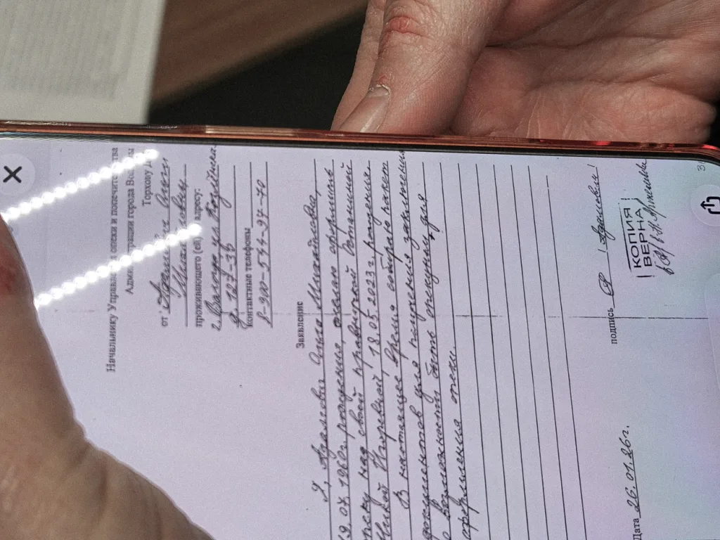 Через несколько дней после похорон внучки, 26 января, Ольга Адамович пришла в вологодскую опеку и написала заявление о том, что хочет забрать правнучку к себе. Позже оказалось, что оно написано не по официальной форме, но прабабушку об этом не предупредили. «Она действовала так, как ей сказала опека Вологды, и не могла допустить, что опека может её обманывать», — объясняет адвокат Надежда Гольцова.